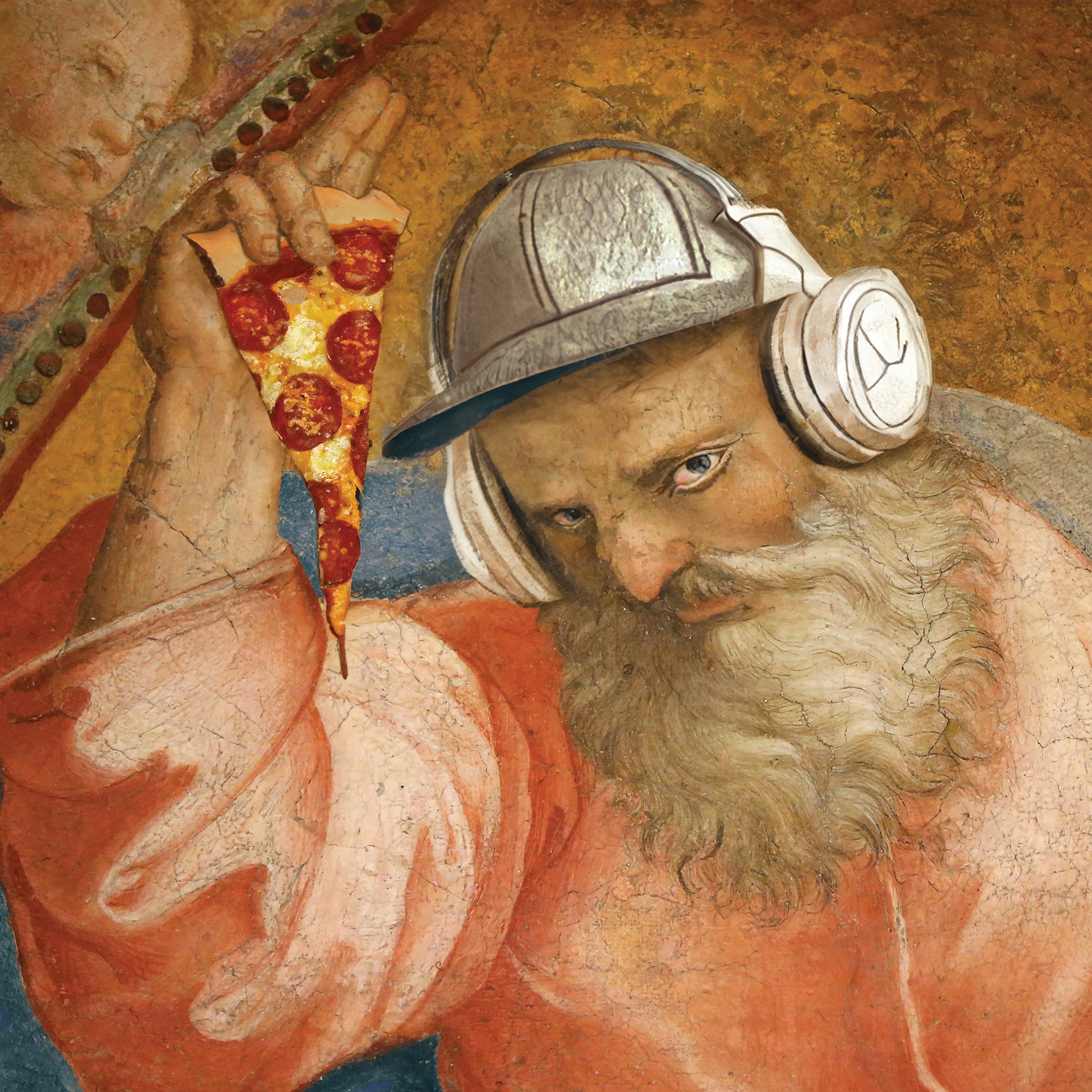 The process began by finding a suitable fresco as a base, for which we purchased usage rights. Then, I used AI to manipulate the image, transforming it into a character and composition that fit the visual identity: a fatherly figure who is also a 90s fashion-loving urban hipster.
